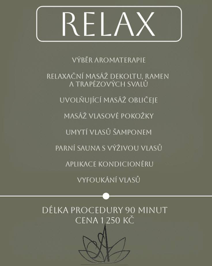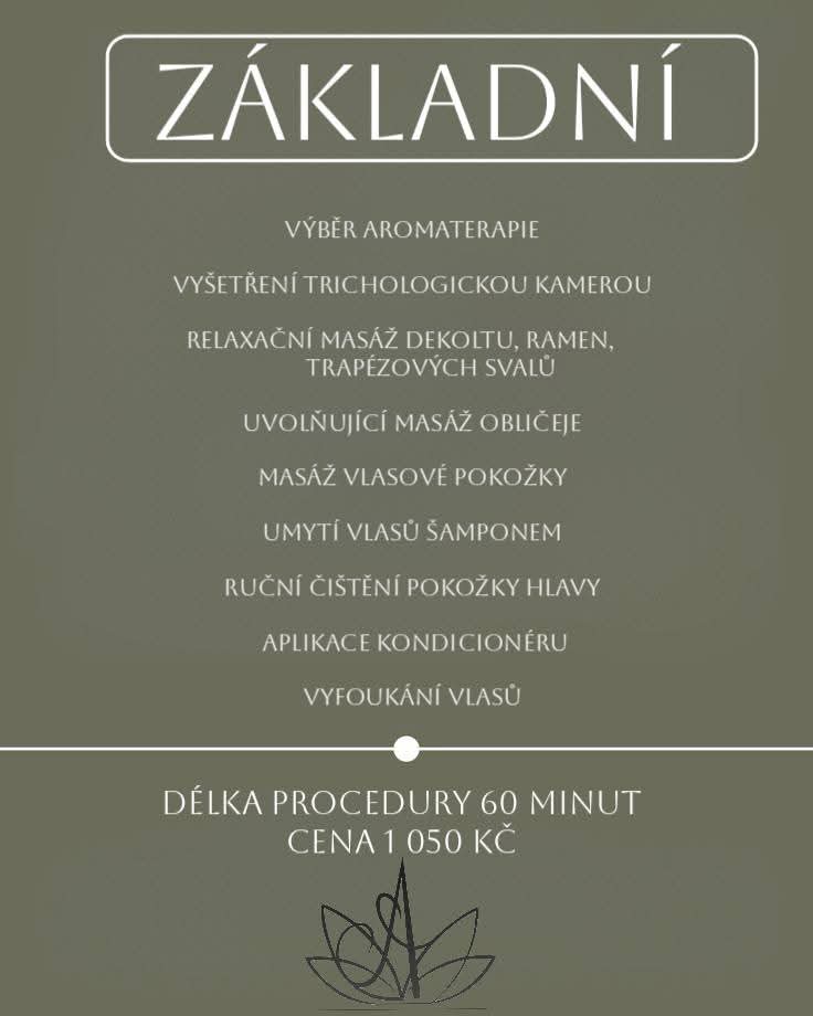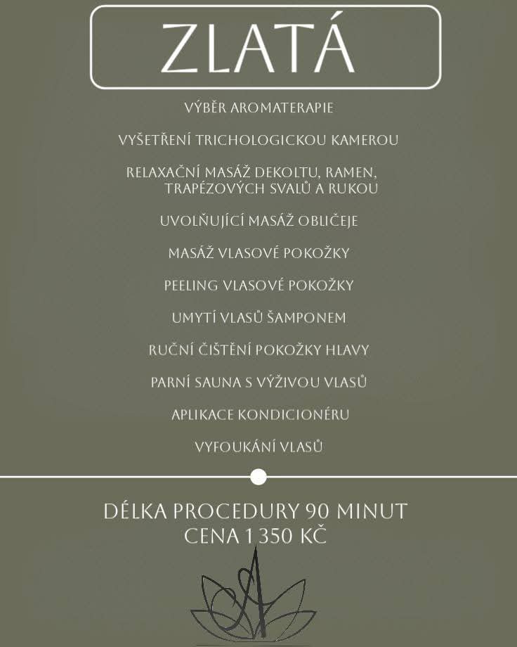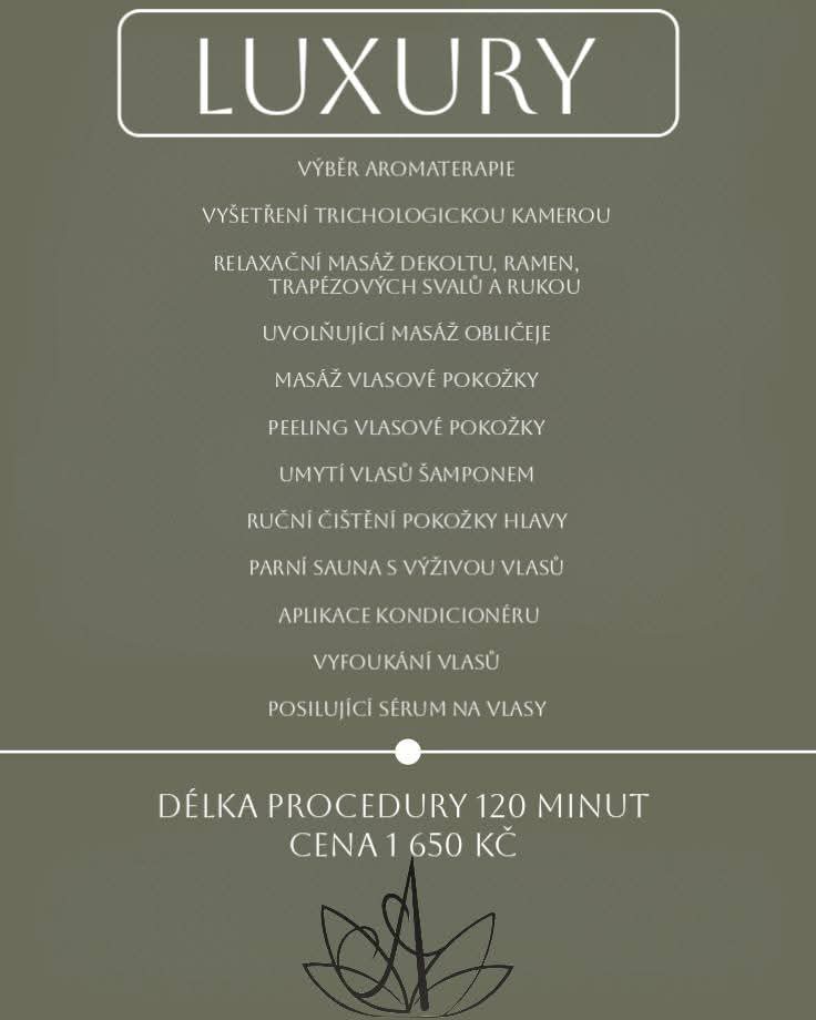V našem salonu si můžete dopřát luxusní relaxaci i odbornou péči o zdraví vlasů a vlasové pokožky. Nabízíme procedury jak s trichologickým vyšetřením,tak i čistě relaxační rituály zaměřené na uvolnění a regeneraci.