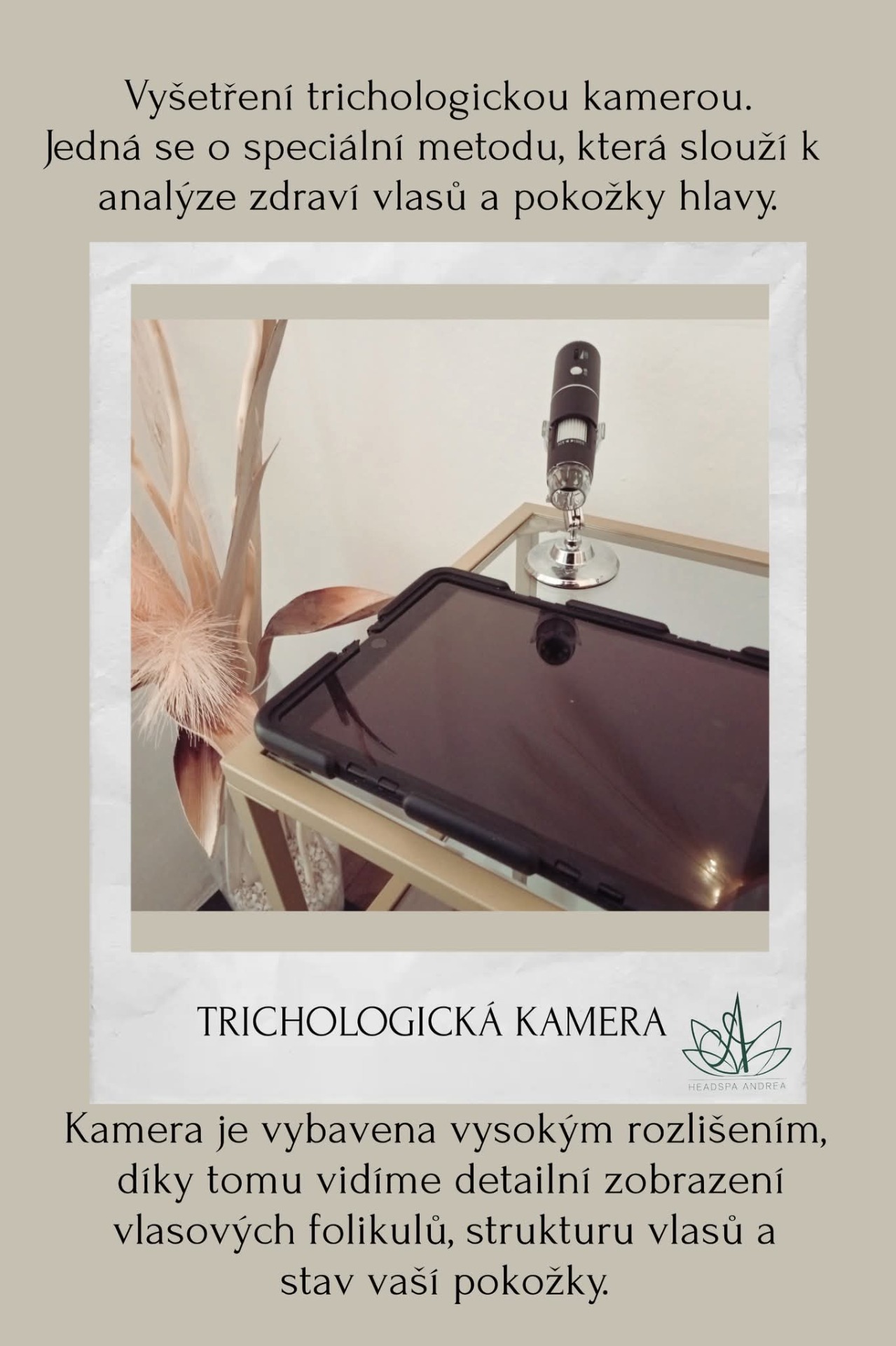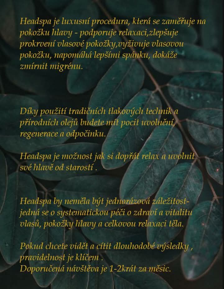 HeadSpa Andrea se zaměřuje na komplexní péči o zdraví vlasů a pokožky hlavy. Nabízíme trichologické vyšetření, hloubkové čištění vlasové pokožky, dokonalou masáž hlavy a další procedury, které zlepší kvalitu vašich vlasů a uvolní vaši mysl.